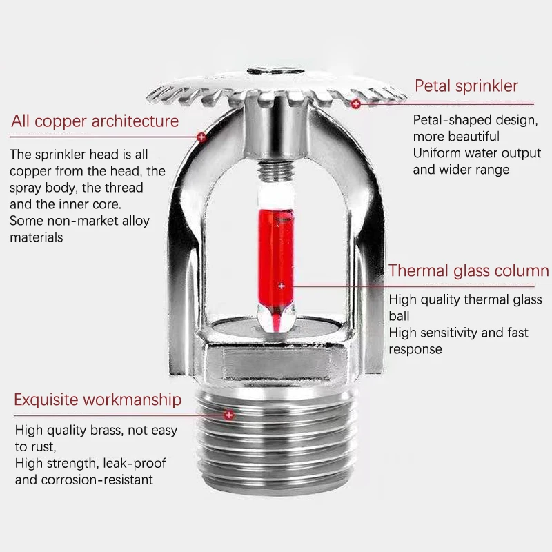 The sprinkler head is assembled by copper alloy frame, glass ball and seal, compact in shape and beautiful in appearance.